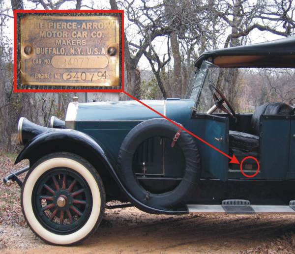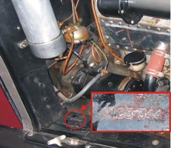 Stamped on large metal plate attached to side of frame near rear of front spring, usually on right side of car, but sometimes on left.