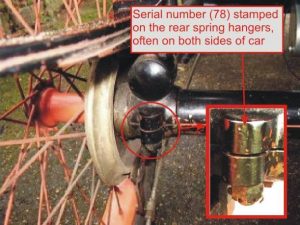 Stamped on the rear spring hangers, often on both sides of car. May also be stamped on the front spindles.