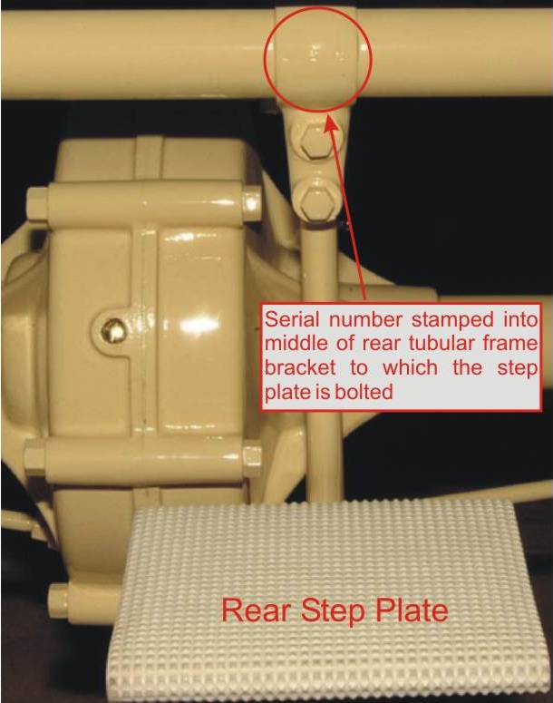 Stamped into middle of rear tubular frame bracket to which the step plate is bolted. On the back end of the transmission case