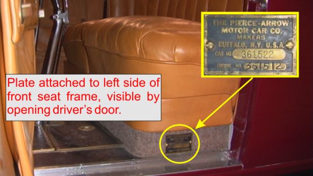 Some cars identified with plate showing car and engine number, attached to left side of front seat frame, except runabout, coupes, brougham and four passenger touring, on which number plate is located on dash plate under cowl.