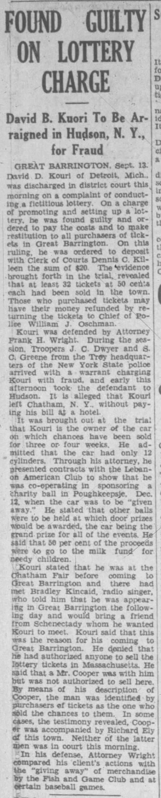 KOURI BEGAN PROMOTING THE CAR AS THE GRAND PRIZE IN A RAFFLE. FOR SOME REASON, THE RAFFLE WAS NEVER HELD. BUT KOURI WAS ABLE TO SELL A SUBSTANTIAL AMOUNT OF RAFFLE TICKETS IN SEVERAL DIFFERENT CITIES. THE NEWSPAPER ARTICLE SHE HAD, REPORTS THAT THE CAR WAS VALUED AT $25,000. ANOTHER SHOWS THAT IS COST $30,000 TO BUILD. SHE WENT ON TO EXPLAIN THAT DAVID KOURI WAS INVITED TO SPEND SOME AMOUNT OF TIME WITH ONE OF THE MICHIGAN PENAL INSTITUTIONS. APPARENTLY SOMEONE TOOK A DIM VIEW OF HIS HAVING SOLD SO MANY RAFFLE TICKETS, AND THEN NOT HAVING THE RAFFLE. GO FIGURE!
